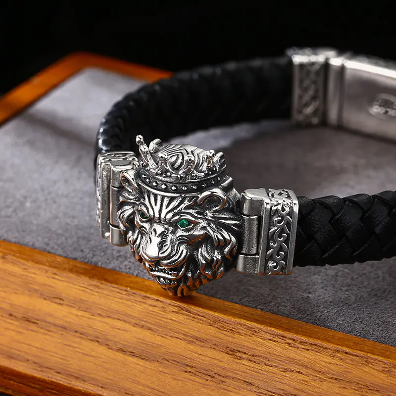 Silver Bracelets Braided Real Leather Band Lion Head Charm 205