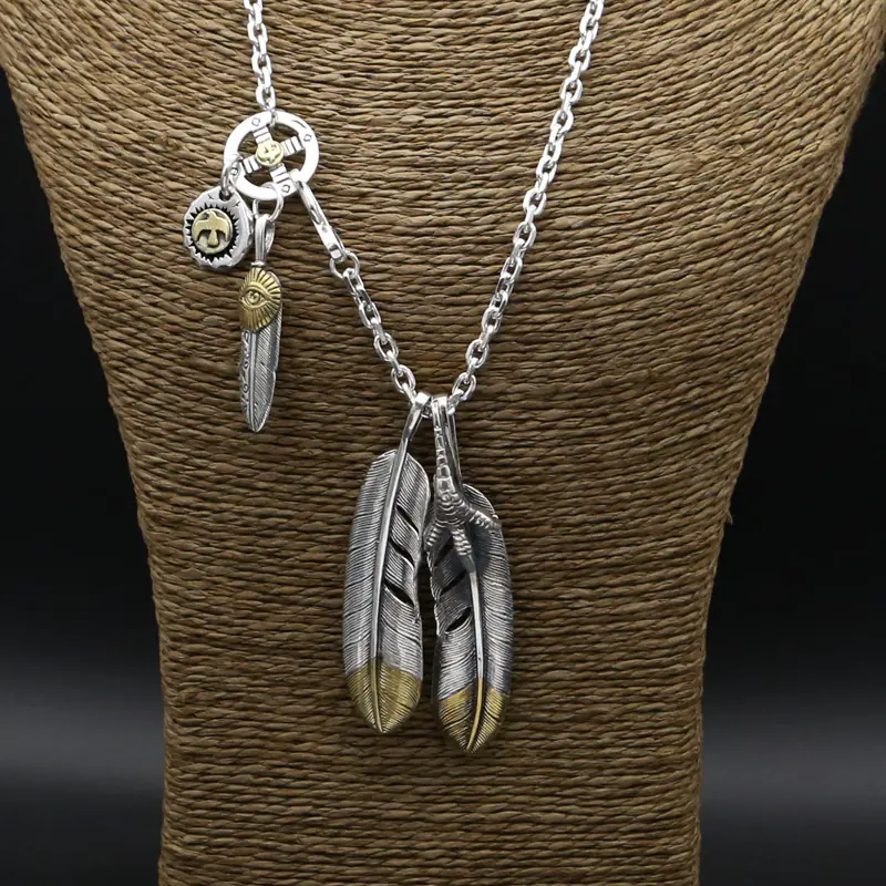 Silver Pendant Necklace Feather Bull Head Vintage Style 279