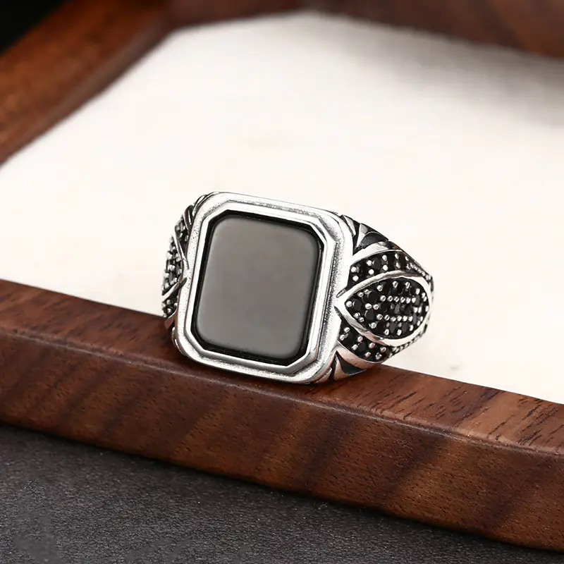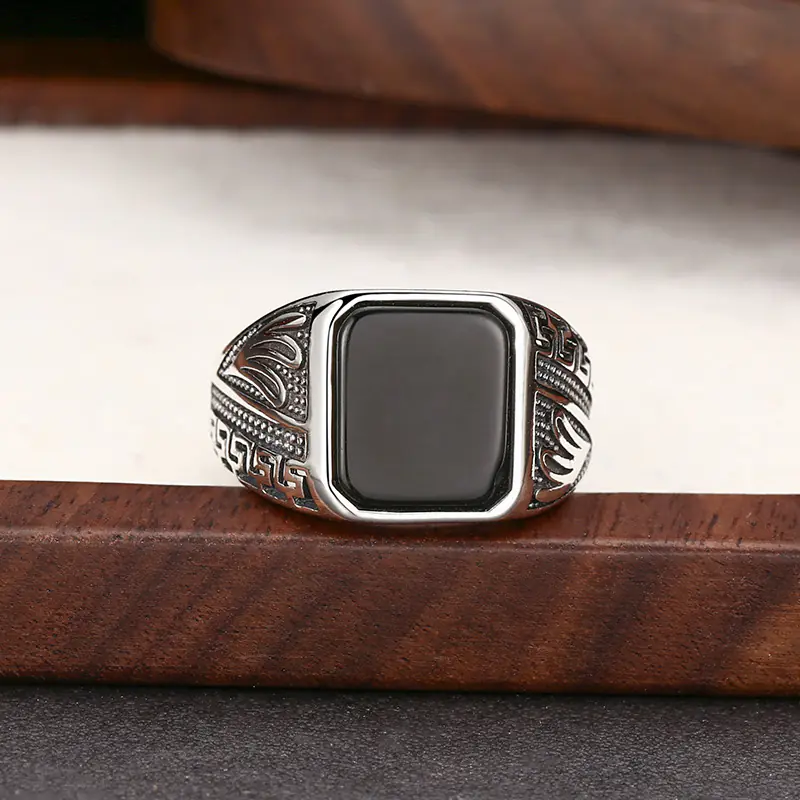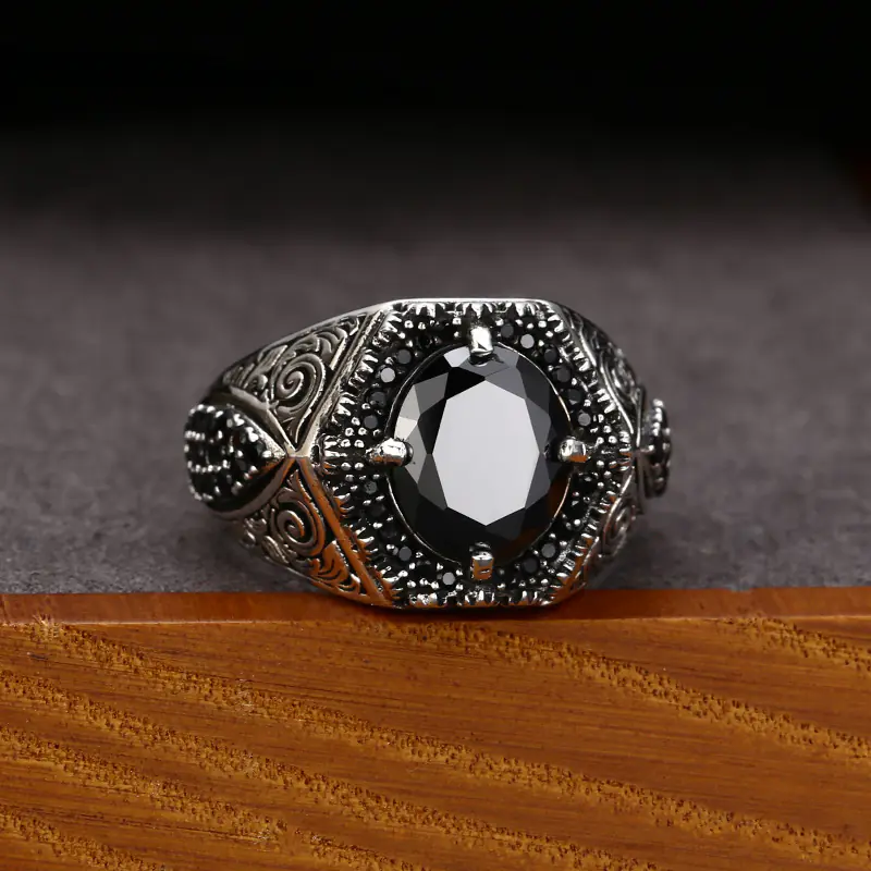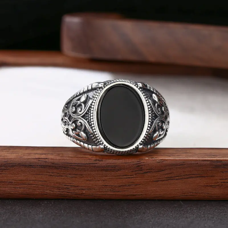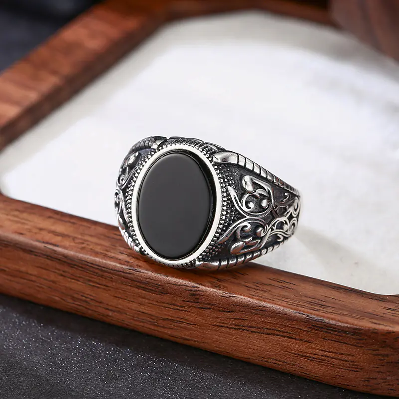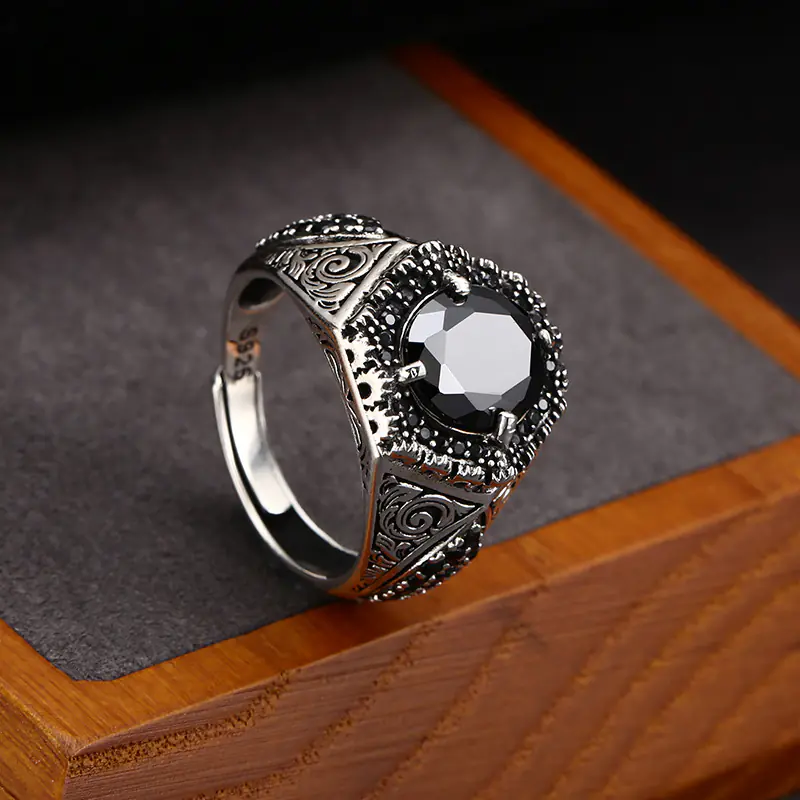 Silver Adjustable Rings Textured Black Stone Vintage Style 151