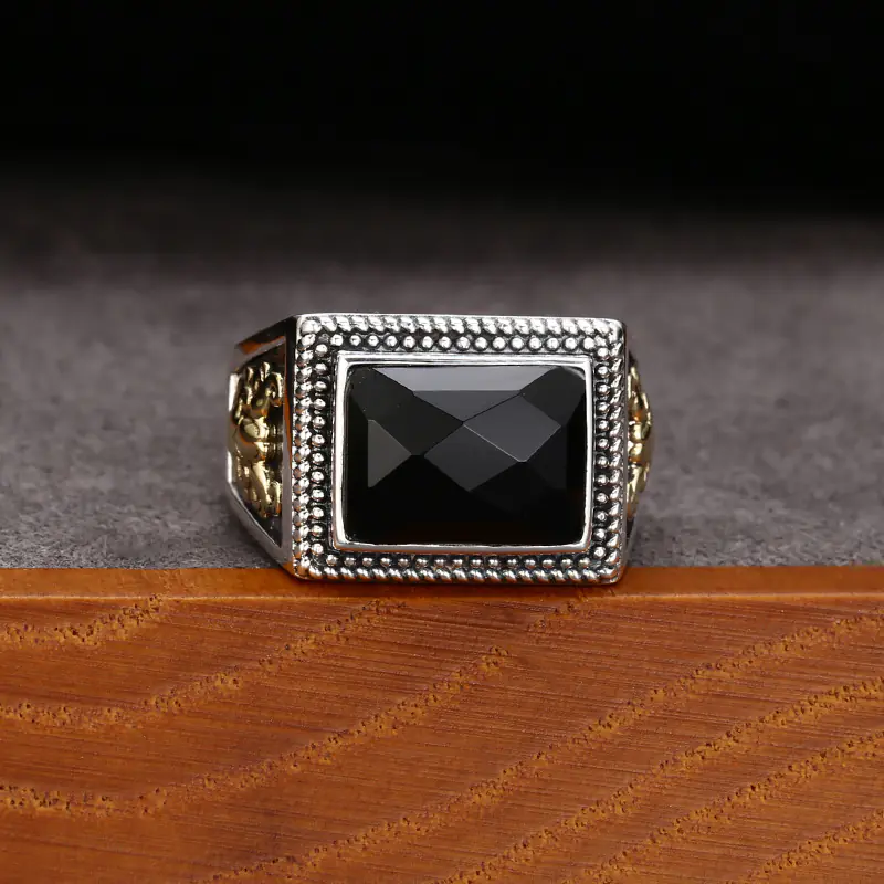 Silver Adjustable Rings Two-Tone Facet Black Stone Vintage Style 153