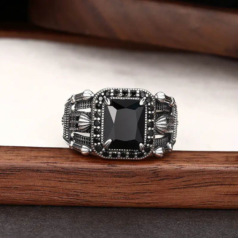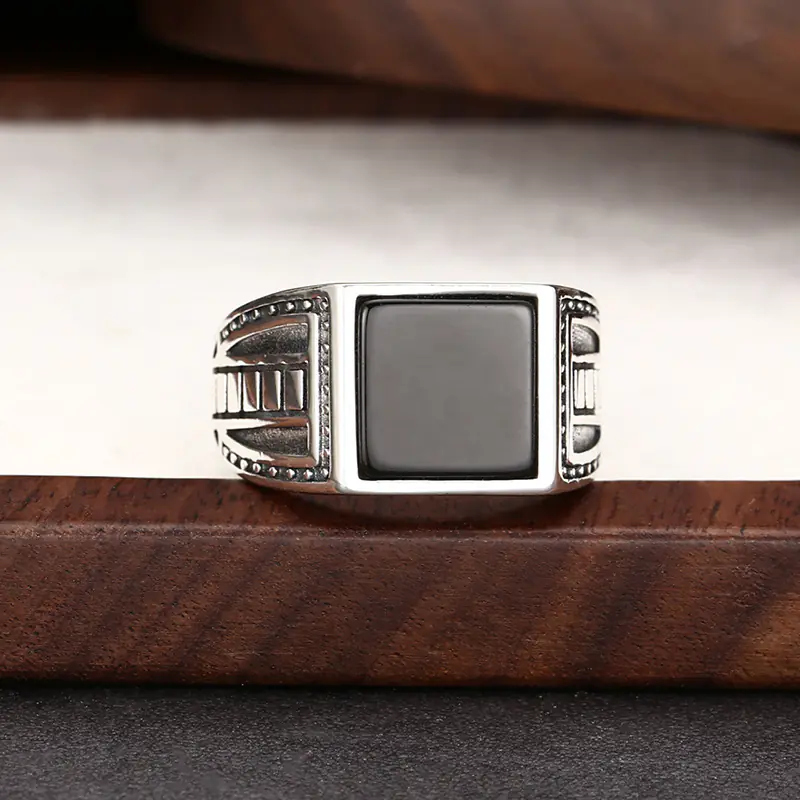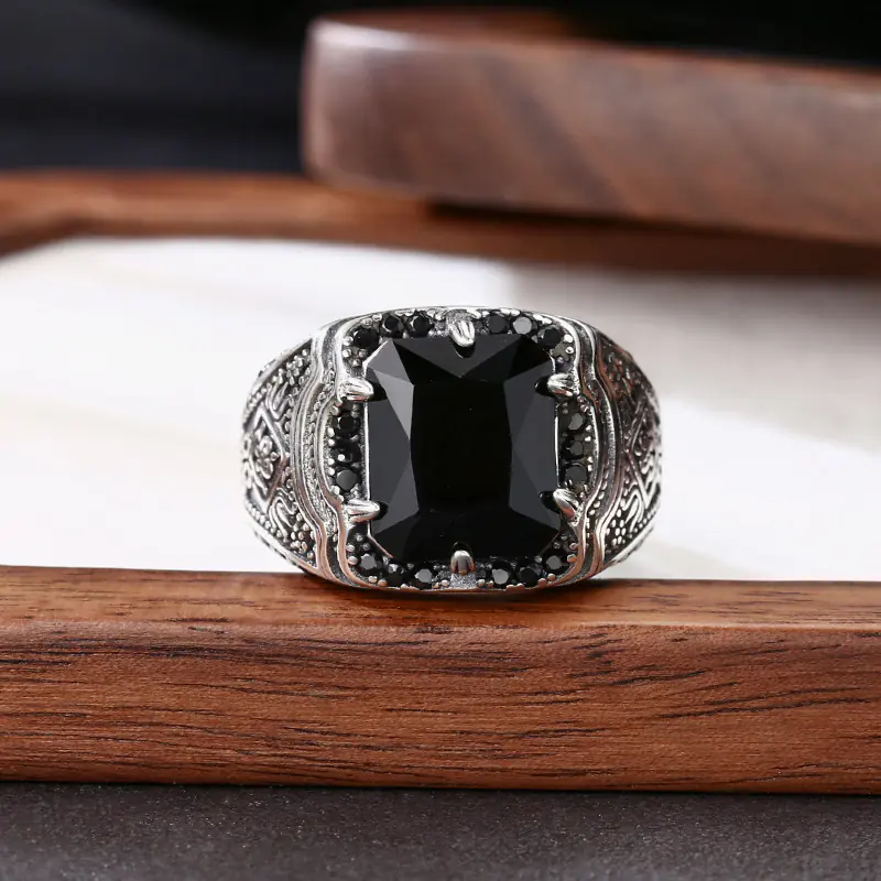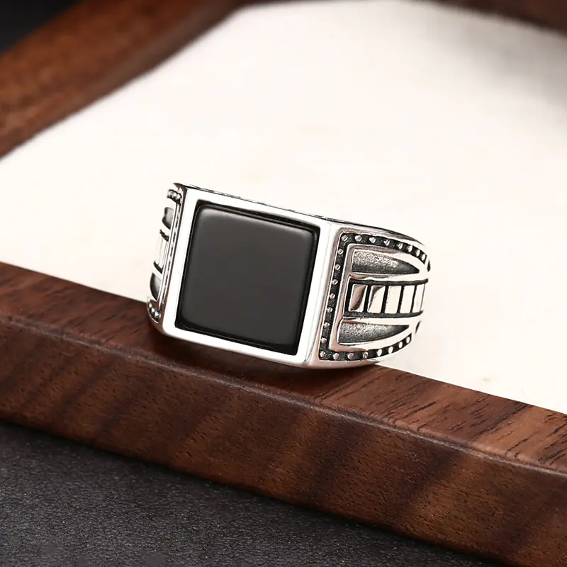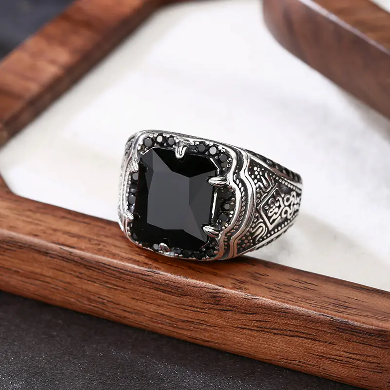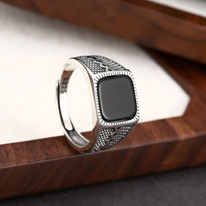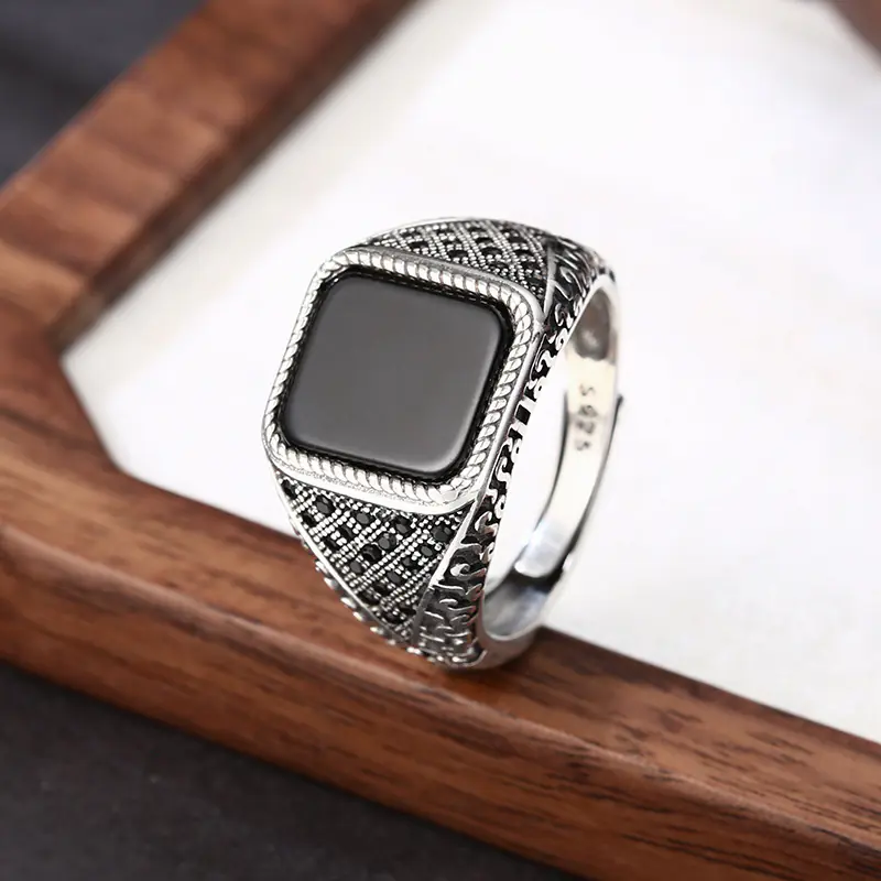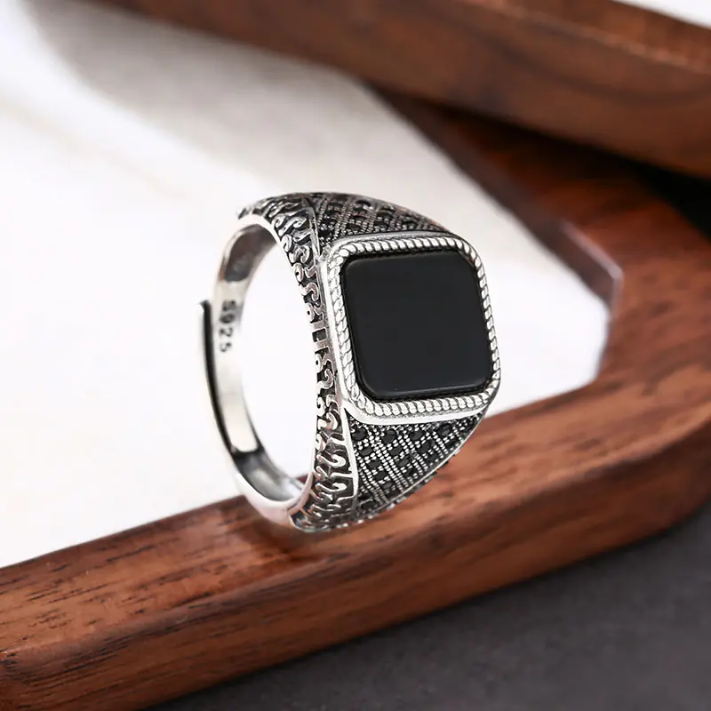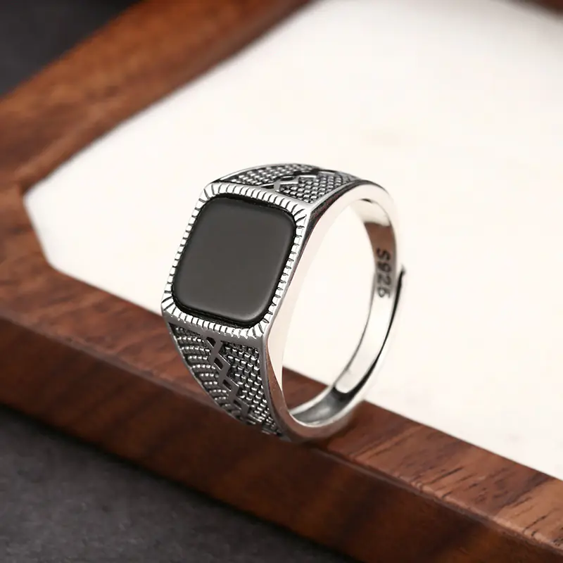 Silver Adjustable Rings Black Square Stones Vintage Style 143