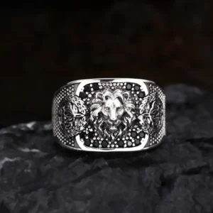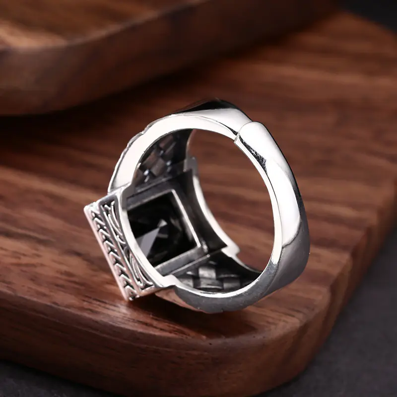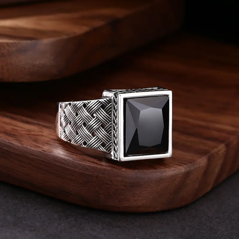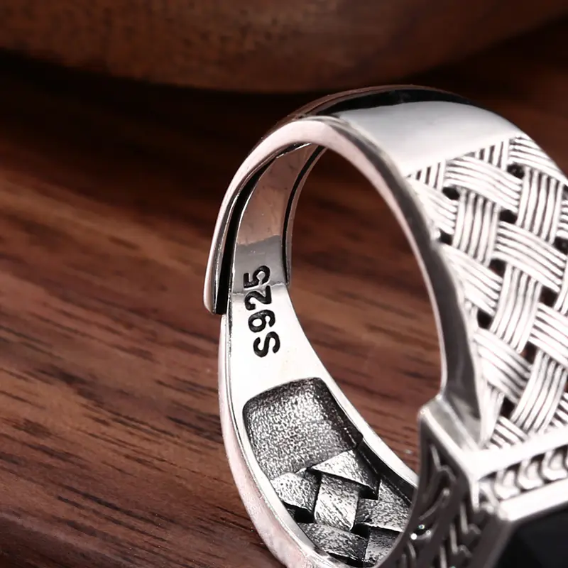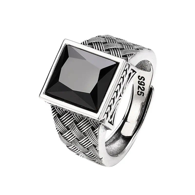 Silver Adjustable Braided Textured Ring With Black Square Stone 72