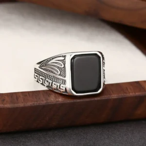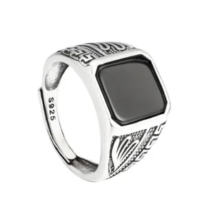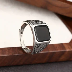 Silver Adjustable Rings Textured Black Stone Vintage Style 151