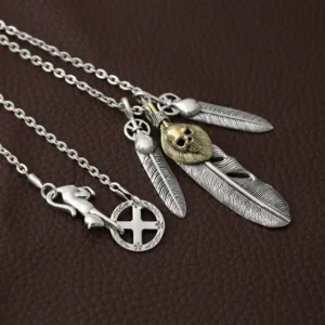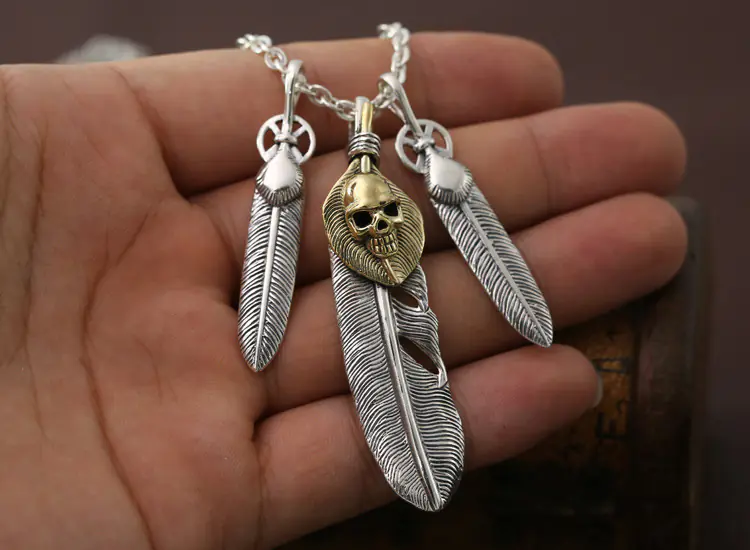 Silver Feather Skull Pendant Necklaces Link Chain Vintage Style 273