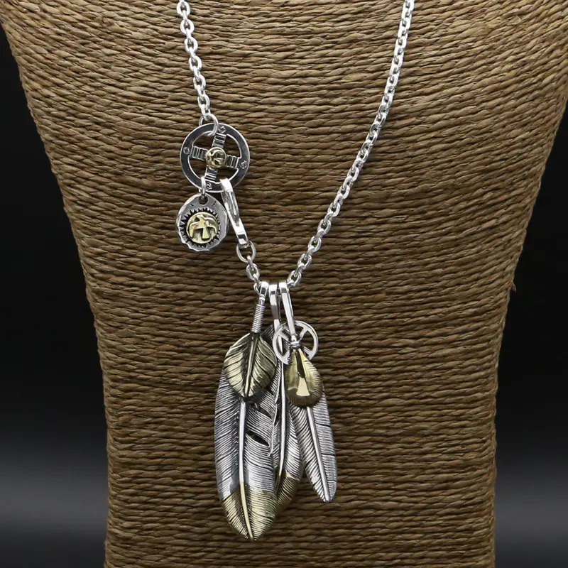 Silver Pendant Necklace Feather Bull Head Vintage Style 279