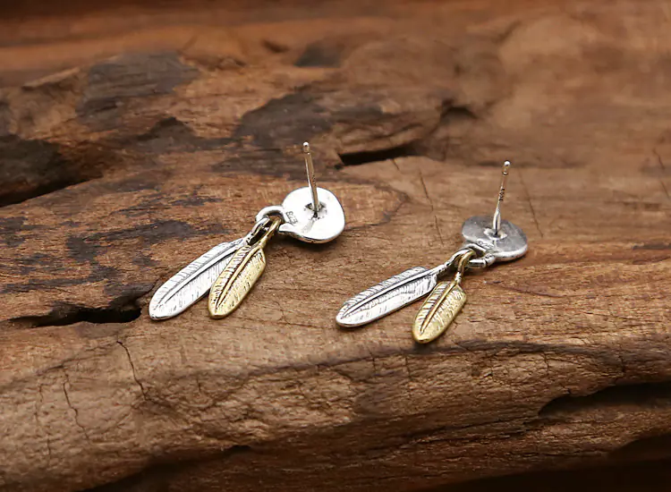 Silver Stud Earring Feather Charms Two-Tone Vintage Style 217