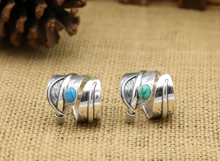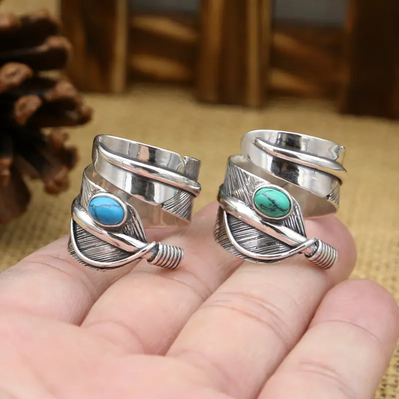 Silver Adjustable Ring Feather With Turquoise Stones Vintage Style 105