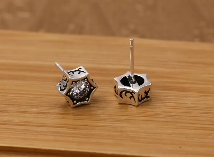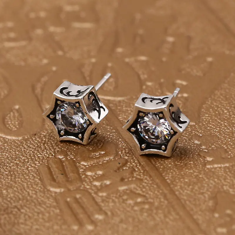 Silver Stud Earring Scroll Star Crystal Stones Vintage Style 244