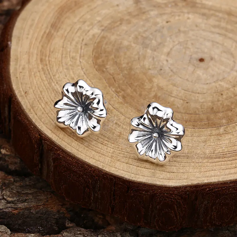 Silver Dangle Earrings Flower Bud Vintage Style 234