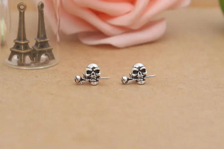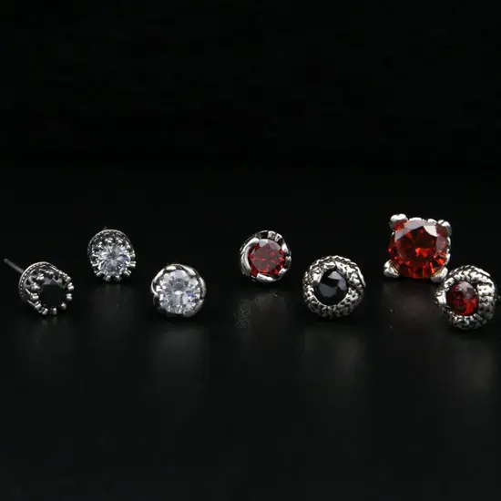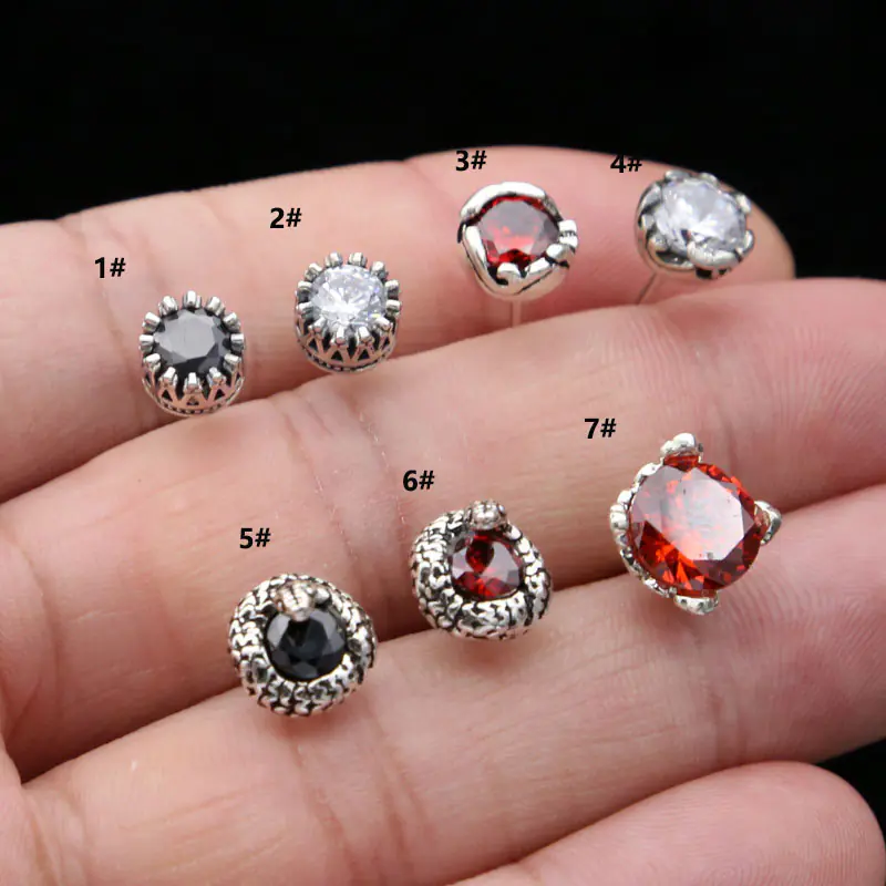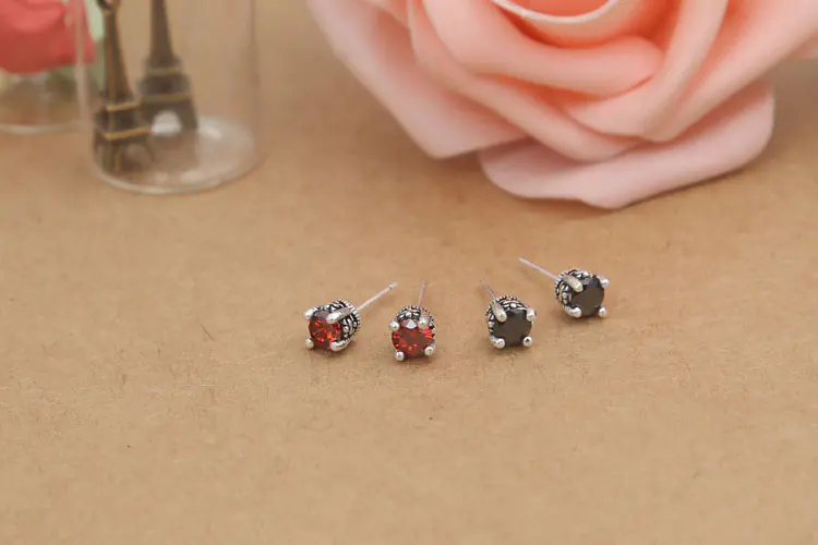 Silver Stud Earrings Red Black Stones Vintage Style 225